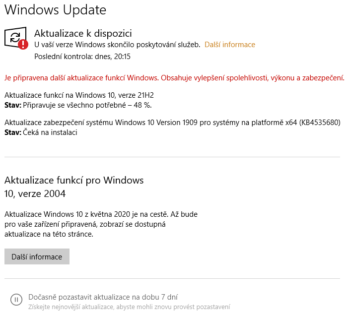 Prostě udělejte tu čistou instalaci. ještě nééé :flyer: Dodatečně přidáno po 1 minutě 3 vteřinách: Tak skús nejakú po tej ,čo prebehla. Tahle prošla taky: February 11, 2021—KB5001028 (OS Build 18363.1379) Out-of-band https://support.microsoft.com/en-us/topic/february-11-2021-kb5001028-os-build-1836...