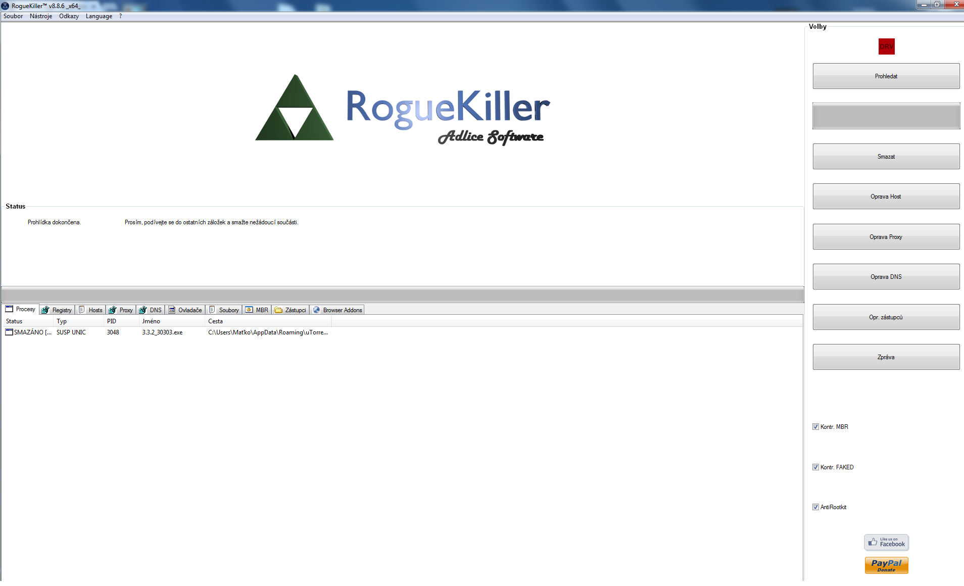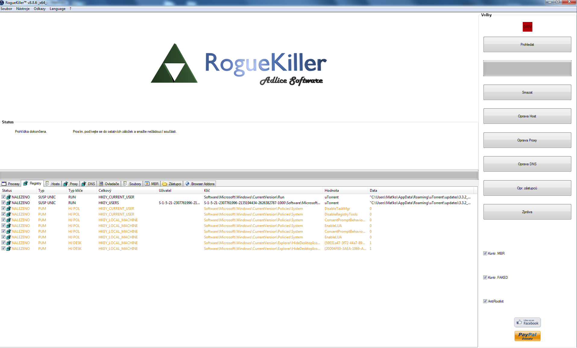 Nechal jsem RogueKiller běžet celou noc, no nakonec nevyhodil log, ale můžu sem vložit printscreen ...