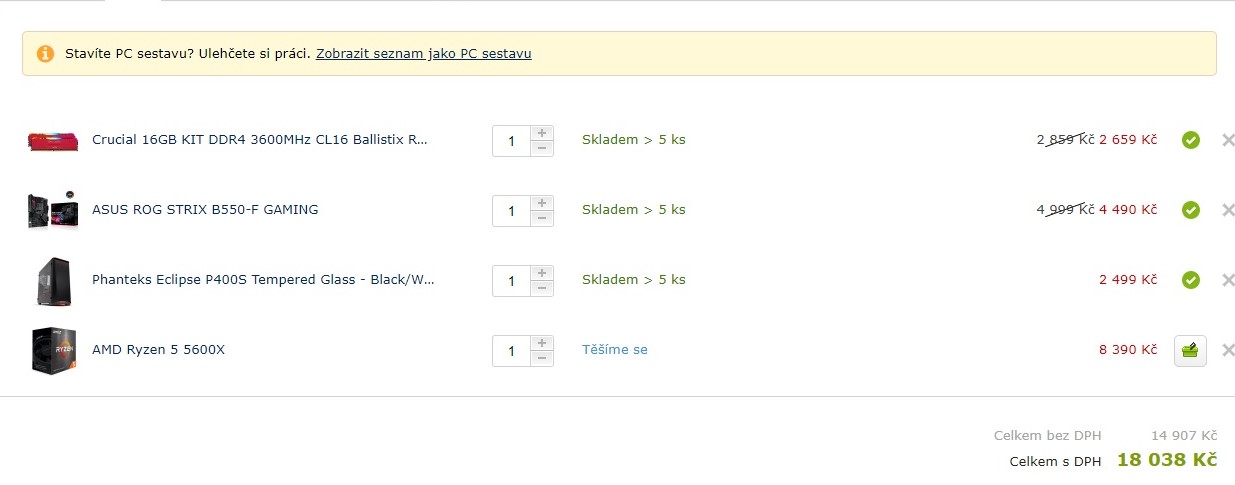 Já bych to koupil z jednoho místa tak prostě počkám až bude no.. na czc píšou že mají skladem 5800X což by byla varianta kdybych trochu přidal ale když se podívám na videa kde srovnávají 5600X a 5800X tak rozdíl je strašně malej, pod 10fps. Rozdíl v ceně 4000.. nevím no.