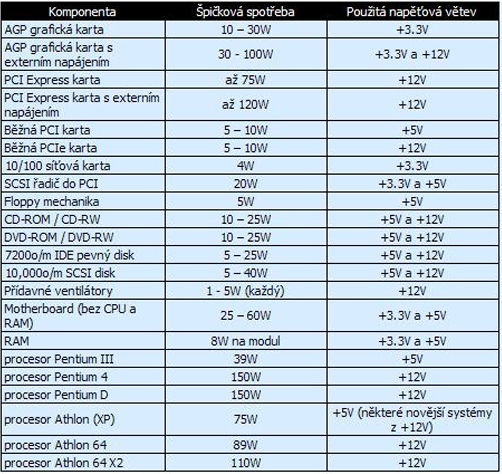 Kolik spotřebují jednotlivé komponenty počítače? Podle PC Power & Cooling, Inc. jsou čísla zhruba tyto (tabulku jsem lehce upravil podle mně dostupných údajů):