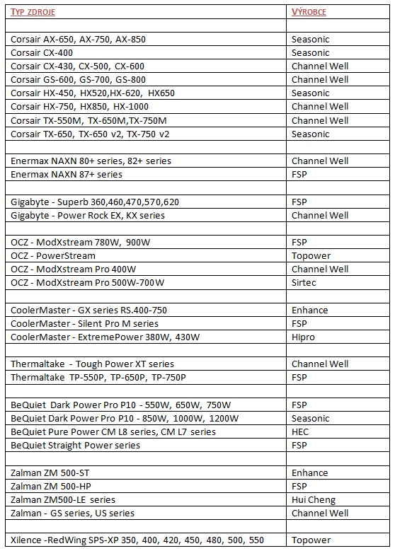 Výběr výrobců některých zdrojů jsem připravil v následující tabulce: