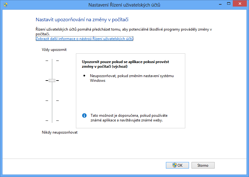 Kdo chce, může si ve Windows 7 i Windows 8 vrátit citlivost do původního vysokého nastavení anebo funkci zcela vypnout, což ovšem není vhodné. Řízení uživatelských účtů je totiž nástroj, který konečně umožňuje pracovat na počítači s uživatelským účtem s právy administrátora, jejichž využití je ovšem podmíněno vědomým souhlasem.