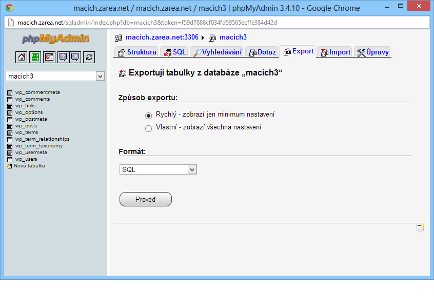 Zmiňovaný phpMyAdmin má funkci Export, díky které si lze celou databázi nebo jen její vybrané části stáhnout ve formátu SQL. Pokud se v databázi nevyznáte, raději ji zálohuje celou (nepokoušejte se rozlišovat důležitá a nedůležitá data). Po spuštění exportu se začne stahovat soubor. Webový prohlížeč bude oznamovat, že soubor má neznámou velikost, jelikož se teprve generuje.