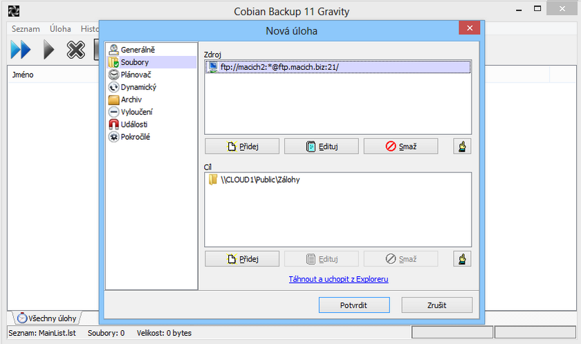 Může zálohovat soubory přes FTP ze serveru webhostera stejně jednoduše jako z pevného disku počítače. Stačí jen použít webhosterem sdělené údaje pro přístup z FTP klienta. Tedy jméno či IP adresu FTP serveru, uživatelské jméno a heslo. Cobian Backup pak může zálohu provádět automaticky v pravidelném časovém intervalu.