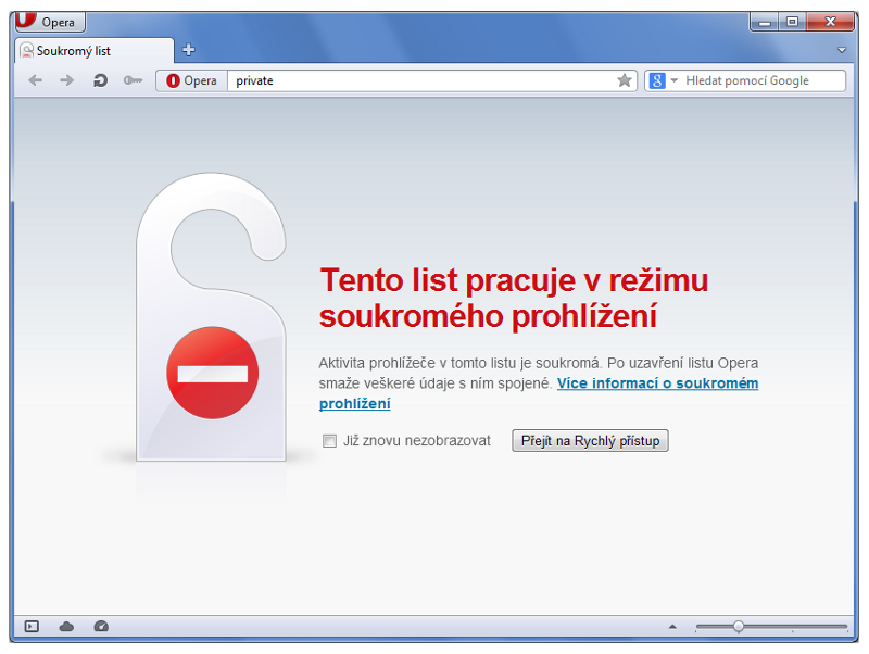Nový anonymní list (panel) v rámci stávajícího okna je nutné otevřít přes menu prohlížeče. Ve výchozím nastavení není k této funkci přiřazena klávesová zkratka, což je ale jen drobná vada na kráse. Soukromé okno i soukromý list (panel) se od těch běžných odlišují symbolem visačky známé z hotelů a motelů, která se věší na dveře, aby personál nerušil.