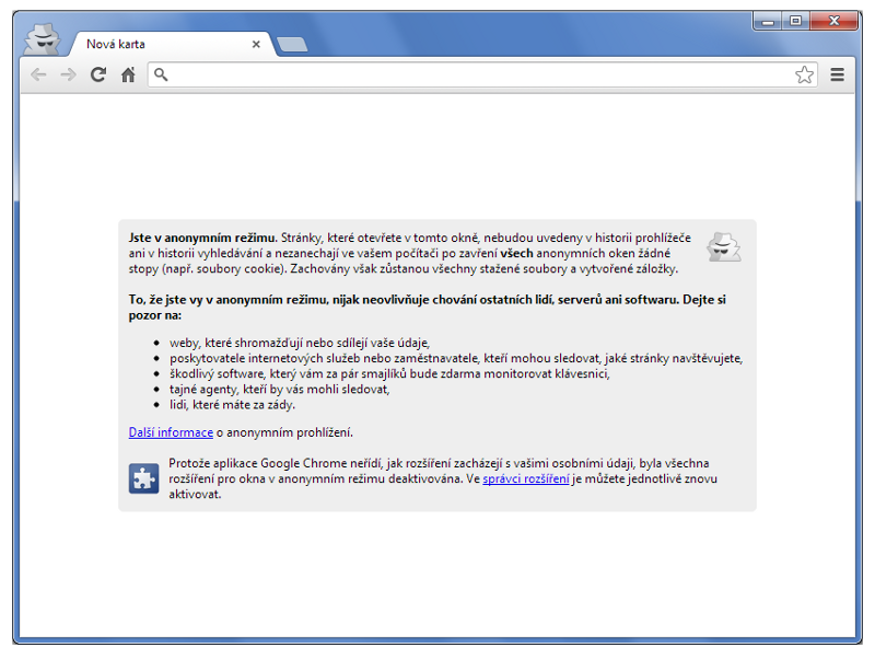 Po aktivaci anonymního režimu se otevře nové okno, v němž je možné surfovat bez obav, že po webové aktivitě zůstanou v počítači nějaké stopy. K zajištění anonymity Google Chrome blokuje veškerá nainstalovaná rozšíření, ale lze je volitelně opět spustit, byť pak samozřejmě není možné garantovat plnou účinnost anonymního režimu.