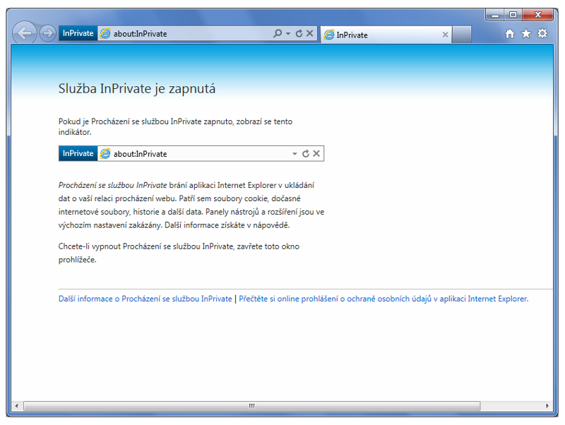 Aby Internet Explorer zabránil tomu, že po surfování přece jen zůstanou nějaké stopy vinou různých doplňků, tak je při aktivaci služby InPrivate automaticky vypíná. To lze v nastavení jednoduše změnit, ale pak již prohlížeč nemůže garantovat účinnost služby InPrivate. Ta je dostupná v Internet Exploreru od verze 8 výše, takže ji mohou používat uživatelé Windows XP a vyšších.