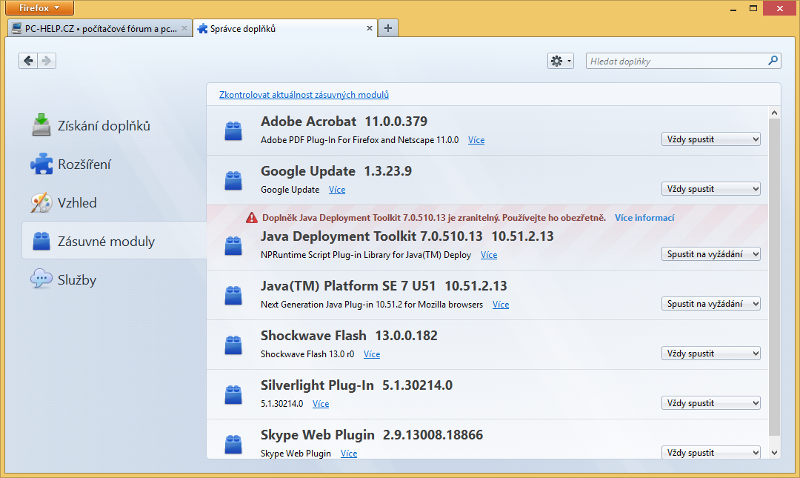Mozilla Plug-in Check funguje i v konkurenčních prohlížečích, což se hodí. Ještě užitečnější by ovšem bylo, kdyby Firefox zobrazoval aktuálnost plug-inu rovnou v okně jejich správy. Tam se zobrazuje varování na jen v obzvláště závažných případech podobně jako v prohlížeči Google Chrome. Varování je v rukou tvůrců prohlížeče. Nejedná se o automatický proces.