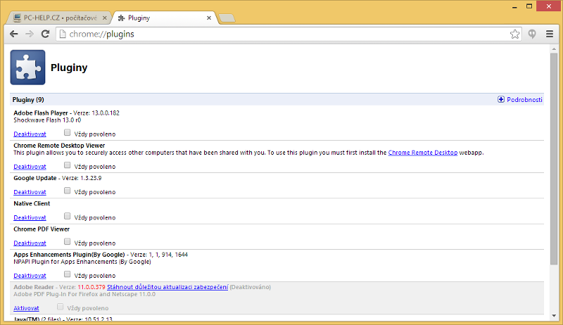 Tolik k aktivaci plug-inů jen v případě nutnosti. Dále stojí za zmínku, že Google Chrome má předinstalovaný vlastní plug-in PDF Viewer pro zobrazování PDF souborů uvnitř okna prohlížeče. Je založen na technologii společnosti Foxit Software (autorů programu Foxit Reader), která je všeobecně hodnocena jako bezpečnější než Adobe Reader a jeho plug-in.