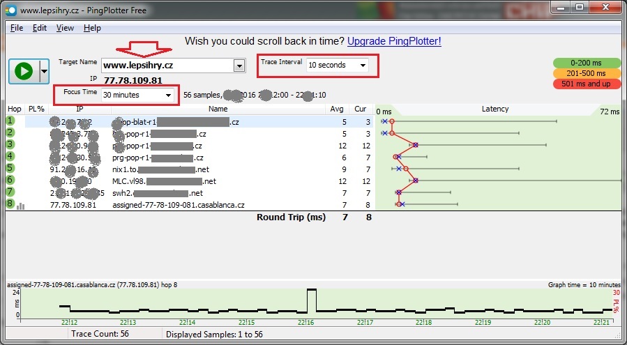 A protože se stále častěji ozývají hráči s problémy, resp. s lagy během hry, hledal jsem nástroj, pomocí kterého by se daly identifikovat chyby sítě i během hry. Tento nástroj se jmenuje PingPlotter: https://www.pingplotter.com/freeware.html