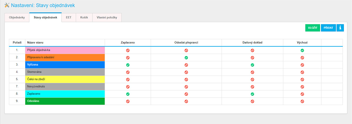 - Možnost nastavit u jednotlivých stavů různé akce (odeslání emailů, přičtění / odečtení skladu, vygenerování štítku dopravce atd.)