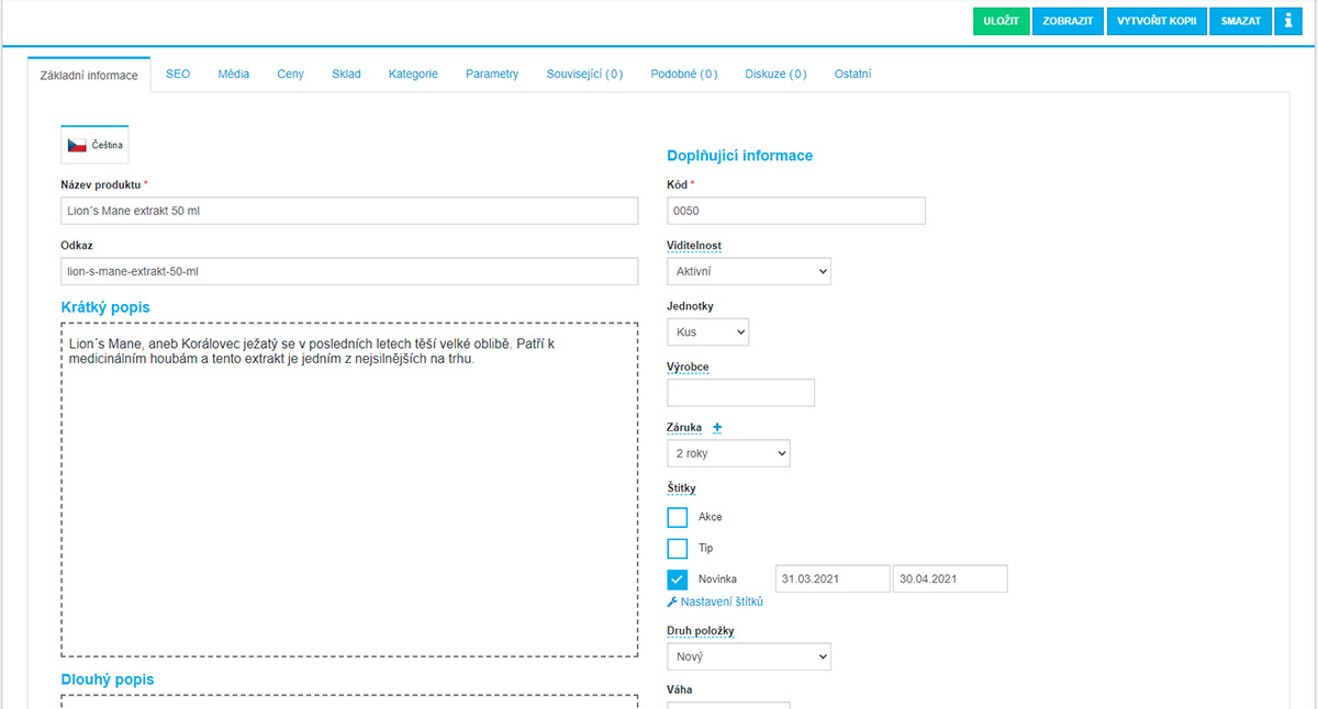 - Možnost vlastních štítků (akce, novinky, sleva atd) a jejich časové omezení