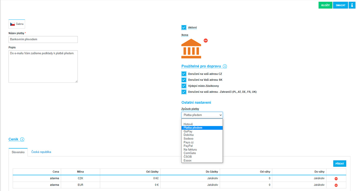 - U dopravy a plateb lze jednoduše nastavit cenu podle měny a státu.