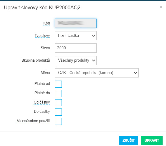 - Slevové kódy s možností nastavení času, kategorií, počtu využití atd. Taktéž statistika, kolikrát byl využit.