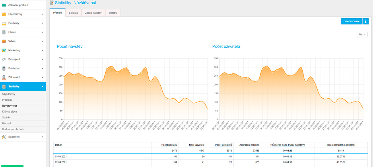 - Statistiky prodejů jednotlivých položek, statistiky návštěvnosti, klíčových slov, atd.