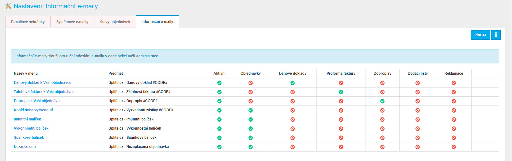 - Možnost šablon emailů, které je možné zasílat jednotlivým objednávkám.