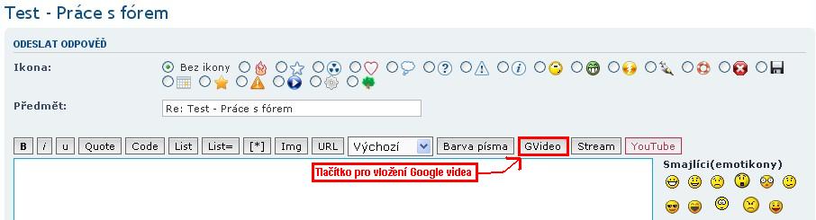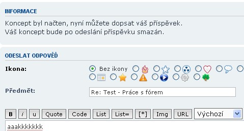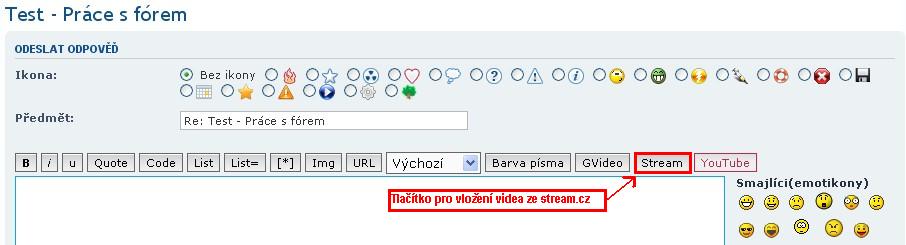 Průběžně tak jak píšu text odpovědi mohu kliknutím na jednotlivé smajlíky (pokud mám smajlíky povolené) tyto smajlíky vložit :o Pak :D mám :smile: například :shock: takto :? prosmajlíkovaný :lol: text :P