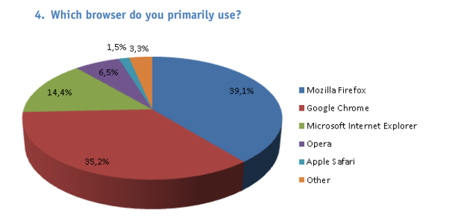 Zpráva IT Security Survey 2013 přinesla i další diskutabilní údaje. Například webovým prohlížečům má vládnout Mozilla Firefox s podílem 39,1 %. Prohlížeč Google Chrome s podílem 35,2 % má být druhý a Internet Explorer při podílu 14,4 % pak až třetí. I těmto číslům se obtížně věří.