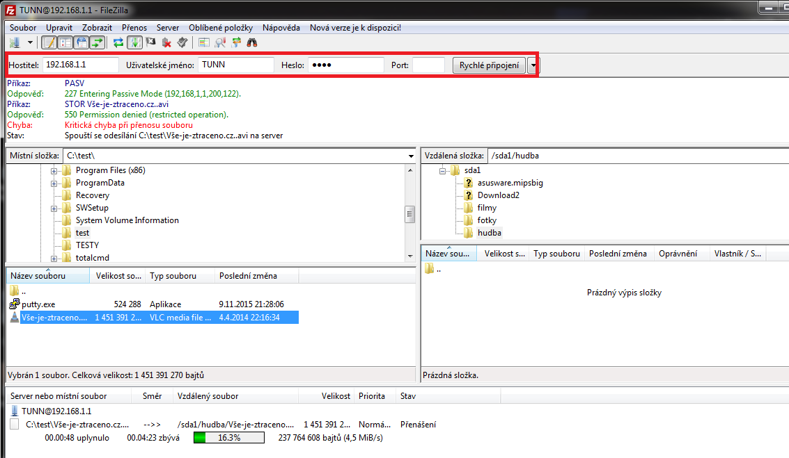 Na libovolné PC ve své síti nainstaluješ klienta FTP. Spustíš. Jako přihlašovací údaje zadáš IP adresu routeru ve vnitřní síti (zde 192.168.1.1), jméno a heslo. Klikneš na Rychlé připojení. Tím se připojíš k FTP serveru. Na levé straně máš místní PC, na pravé FTP. Vyzkoušíš funkci.