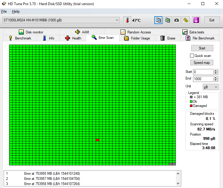 Ještě připojuji výsledek Error Scanu z HD Tune. Test se mimochodem nedokončil...