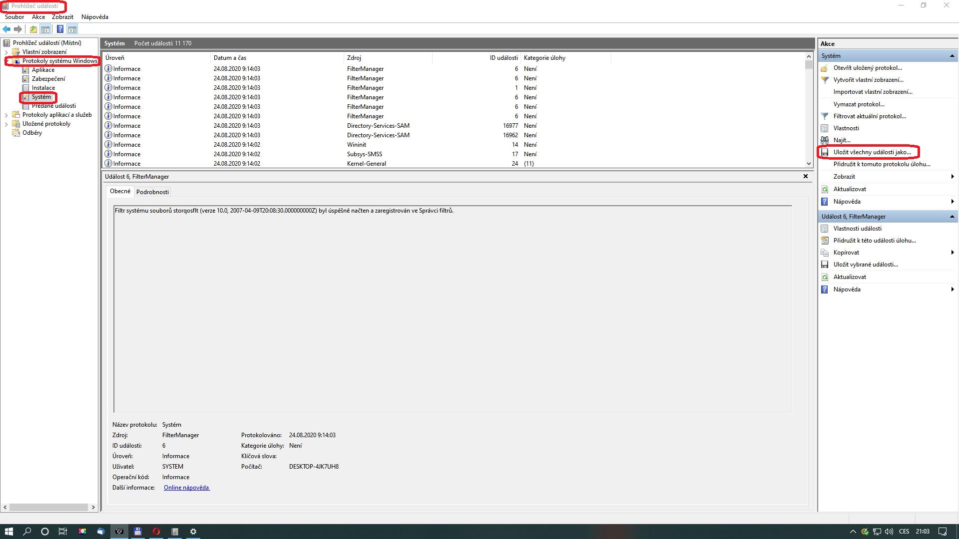U 2. kroku je v návodu napsáno ..Protokoly systému Windows->klik pravým myšítkem na protokol Systém vybrat Uložit všechny události jako, uložit jako.
