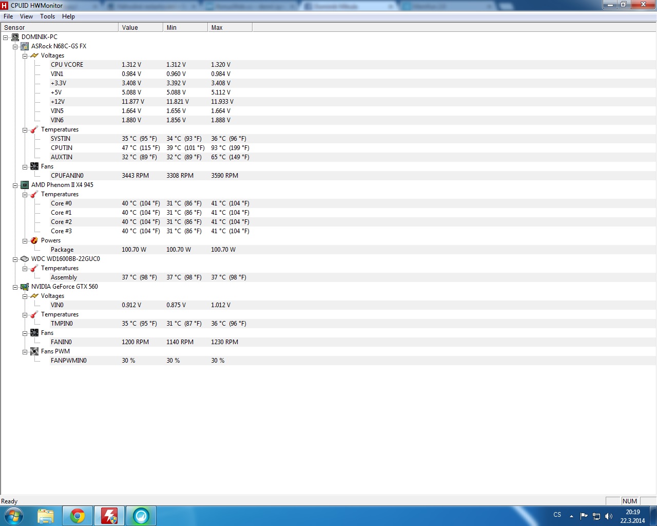 PC: skládané CPU: AMD Phenom II X4 945 3,0 GHz RAM: 8GB DDR3 Kingston HyperX blu GPU: GAINWARD GTX560 GS Motherboard :AsRock N68C-GS FX Zdroj: Fortron HEXA 500W