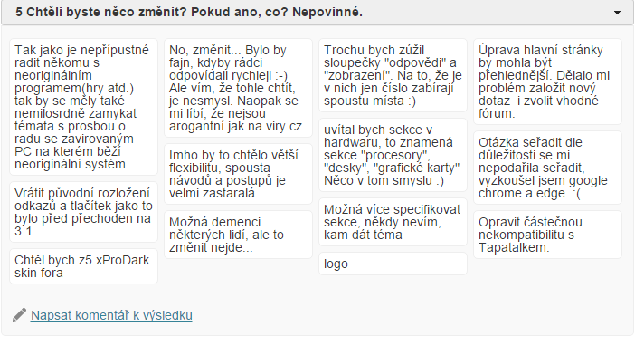 . //edit: Akorát je blbý, že já už jsem ho udělal na mobilu a kdybych chtěl, tak když si to teď rozkliknu na PC, tak ho můžu dělat znova.. Chtělo by to udělat, aby to bylo vázáno jako na profil tady na PC-HELPu a přes který se to už udělalo, tak aby tě to na jiných zařízeních nepustilo. Ale to asi nepůjde, když ten dotazník není přímo na foru...