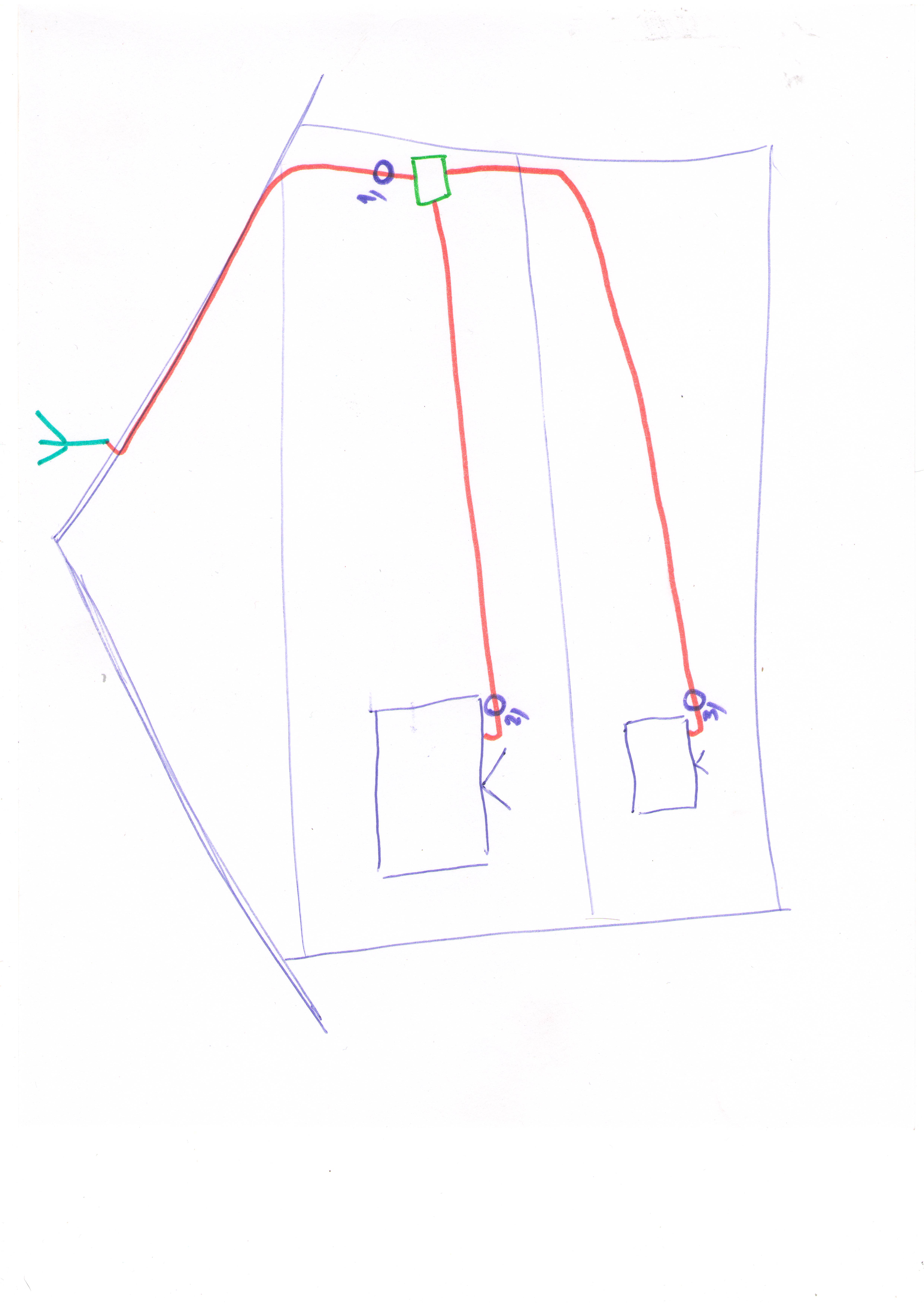 Anténa Sencor SDA-500 je umístěná na střeše, od ní je nazažen koaxiál do napájení (fialová 1.), do kterého je zapojen pasivní rozbočovač (zelená). Z něj už jsou jednotlivé koaxiály do televizorů.