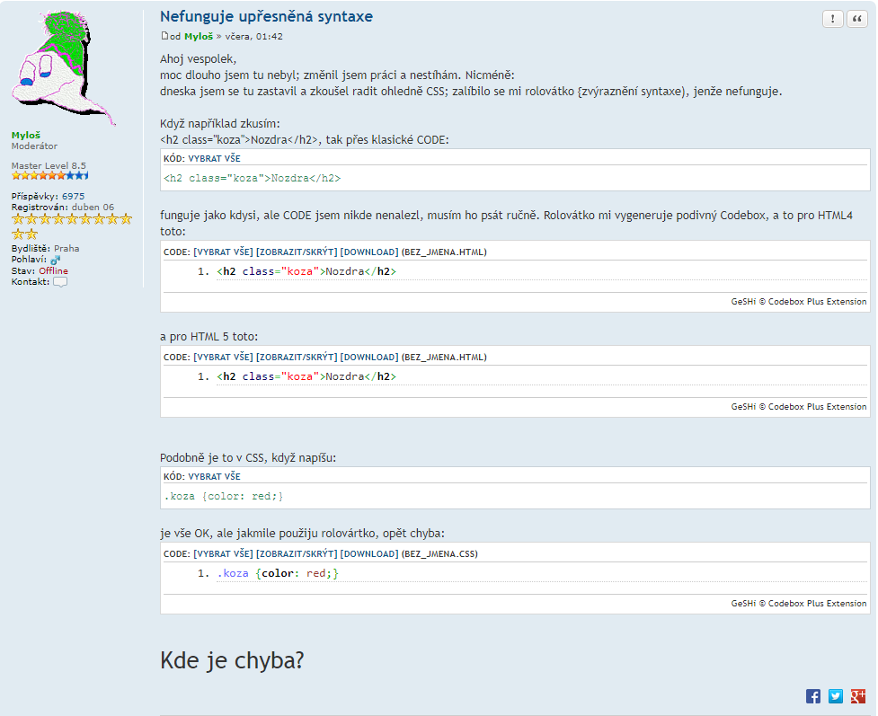<h2 class="koza">Nozdra</h2>funguje jako kdysi, ale CODE jsem nikde nenalezl, musím ho psát ručně. Rolovátko mi vygeneruje podivný Codebox, a to pro HTML4 toto: