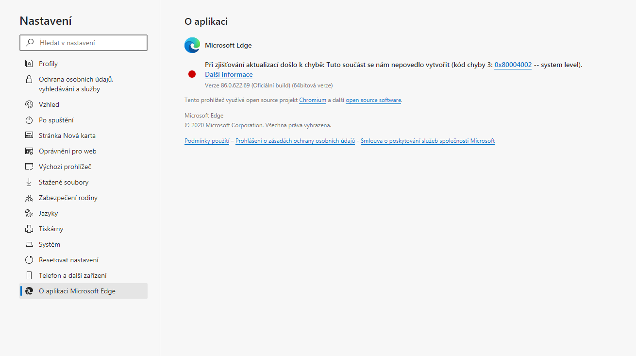 chtěl bych požádat o pomoc s nově nainstalovaným prohlížečem MS Edge. Na svém starém PC s AMD Phenom II X4 945, Gigabyte M56S-S3, 8GB RAM (4x2), SSD Crucial MX500 250GB, Seagate Barracuda 2TB a VGA Ati Radeon HD2600XT Ultimate 256MB, proháním stále Windows 7 x64 včetně všech aktualizací stahovaných a instalovaných v průběhu mnoha let. Jako antivirus je nainstalován denodenně aktualizovaný MS Security Essentials. Na prohlížení internetu se mi osvědčil prohlížeč Opera. Používám jej doma i v práci. Všechny záložky i hesla se bez problémů synchronizují, aktualizace fungují bez problémů a nemám mu co vytknout. Přesto, chtěl jsem vyzkoušet nový Edge. Instalace proběhla bez problémů i vlastní funkce prohlížeče je bezvadná. Nefunguje pouze jediná věc a tou je aktualizace prohlížeče. Při kliknutí na "O Aplikaci Micsrosoft Edge" se objeví toto chybové hlášení: