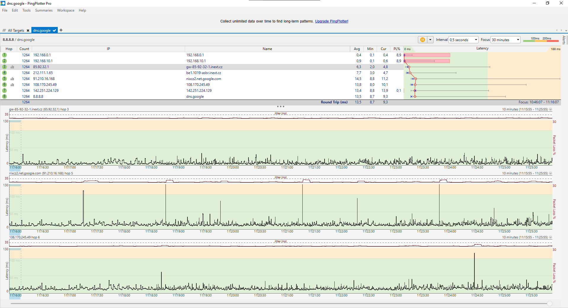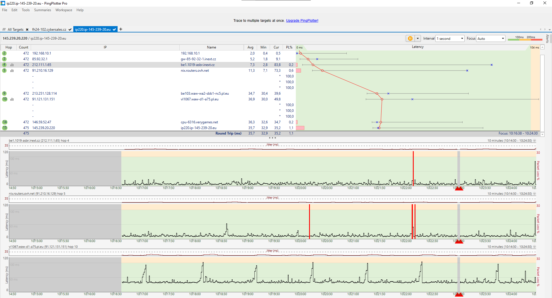 Přikládám obrázek z pingplotteru - ukazuje malou ztrátu packetů na routeru a příjimači hádám. Je vidět, že ping je až na vyjímku stabilní co se týče ze zařízení až k IPS, ale na dalších hopech už se objevuje výrazný packet loss + ping okolo těch (někdy i více než 100 ms).