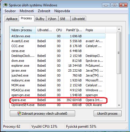 Jinak Chrome se ve Správci úloh na rozdíl od Opery, která je v jednom řádku, objevuje ve více řádcích, mám dojem, že co otevřená stránka, to nejméně jeden řádek.