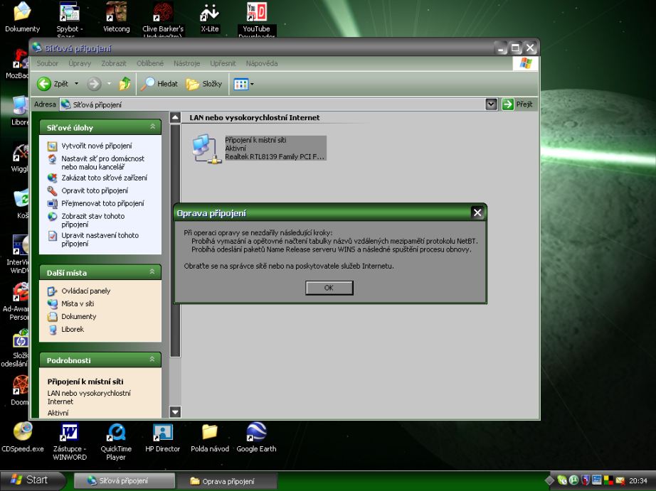 No mě NET jede,ale např.načítám stránky na víc pokusů/ani ne pomalu,ale naněkolikrát/,strašně pomalu mě jde odesílání pošty/příjem úplně bleskem/atd.Prostě tu mám samý problém a pokouším se to nějak dát dohromady.Tohle chci řešit jako první.Dal jsem zakázat a znovu povolit a po Opravě opět stejná hláška!!