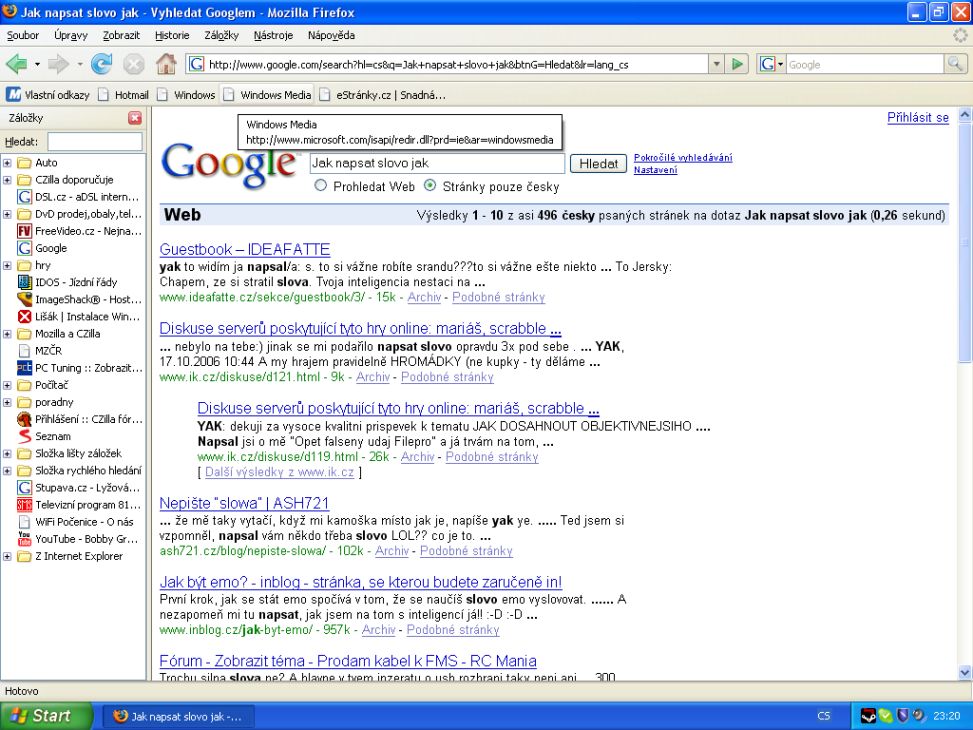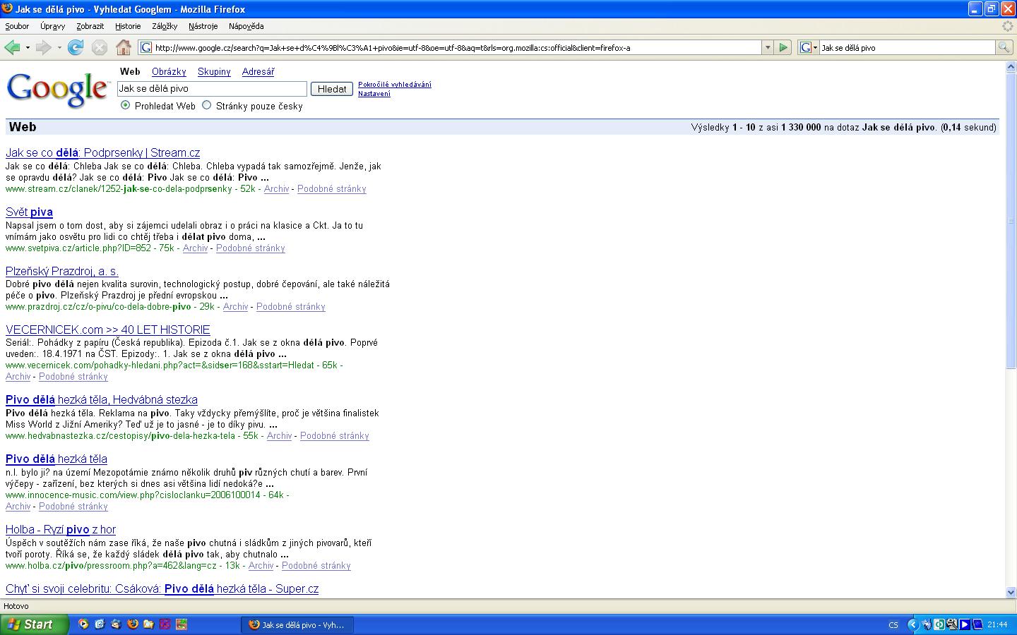mám FF 2.0 a hledám Googlem.Nedávno jsem dělal novou instalaci tak nevím jestli je to tím a taky nevím jestli to nedělá ještě něco.Ale k problému.napíšu do Googla např:Jak se dělá pivo a vyjedou mi odkazy kde místo jak je slovo yak :evil: .tím pádem toho moc není,respektivě nic relevantního.Se slovem jakmi nenaskočí nic!!!Pokud napíšu do vyhledávače jen slovo jaktak potom se to objví správně.Jakmile něco připojím už jsem nahranej a nic nenajdu.Prosím v čem je chyba.V Exploreru se to neděje,hledal jsem nějaký nastavení jazyků,nebo tak něco ale nic.Ovšem dřív jsem taky nic neupravoval a hledalo to normálně.