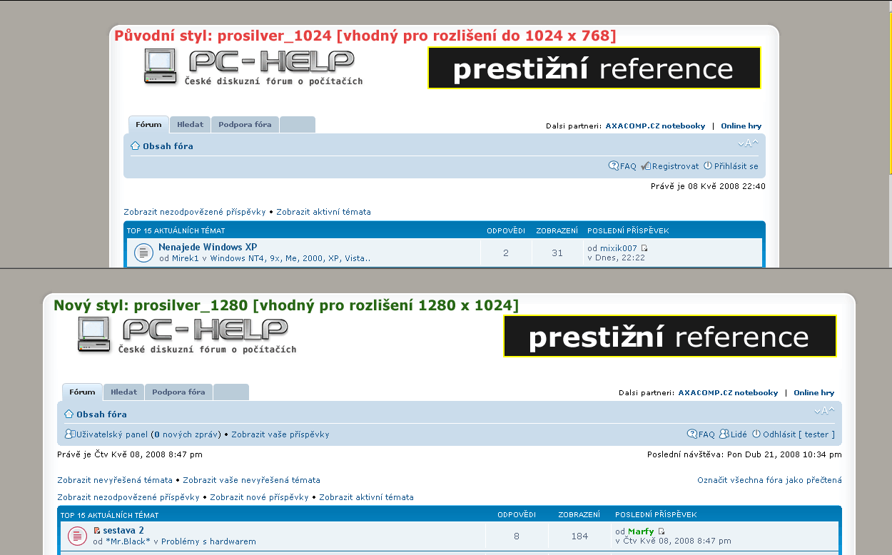 Styl prosilver_1280 je vhodný zejména pro rozlišení 1280x1024 a 1400 x 900. Níže naleznete porovnání s dosavadním prosilver_1024. V případě jakýchkoliv komplikací mě prosím kontaktujte v sekci "Připomínky k fóru".