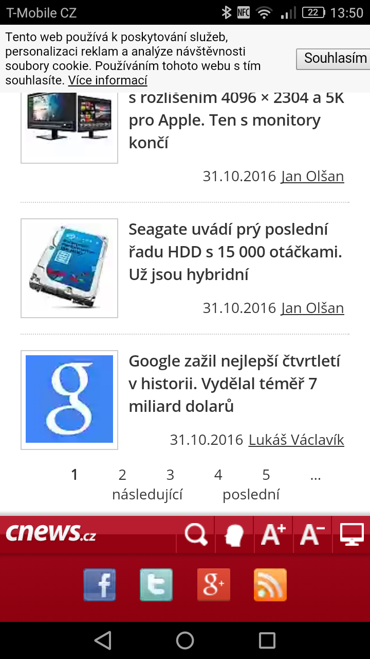 Martab: To prázdné místo vpravo myslím vyřešíme - prozatím jsem neměl čas nahradil banner za responzivní, který se v mobilu chová lépe...tohle v násl. dnech upravím. Co se týče patičky, tam je chyba...mohl bys prosím na tom samém zařízení zkusit, jak se chová patička na cnews.cz a na euro.cz? Dost by mi to pomohlo v dalším pátrání :-)