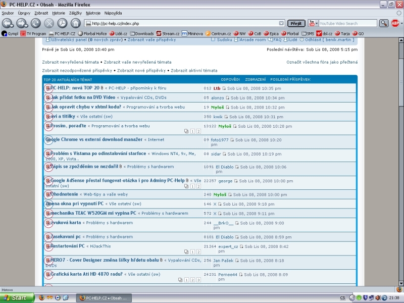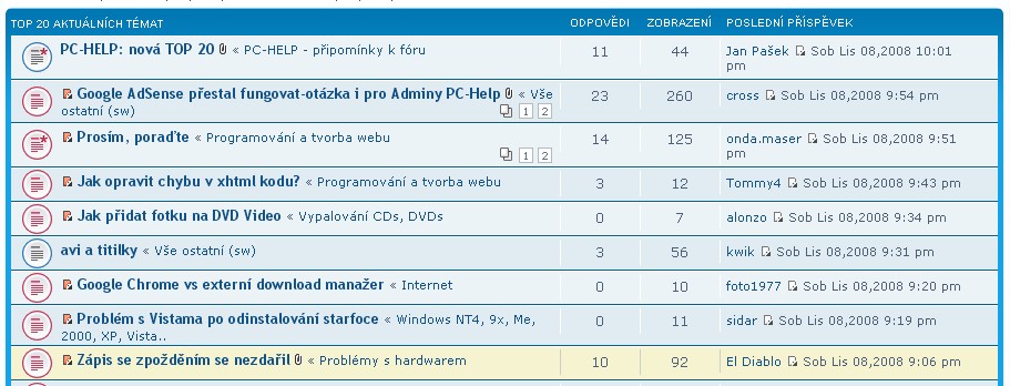 Ještě technická podle toho jak se to zobrazuje mě. bordel v tom dělá kolonka poslední příspěvek záleží hodně na počtu znaků v nicku posledního odpovídajícího. datum pokud jde uvádět celé v číselné formě DD,MM,YYYY čas pokud to jde 24 hodinový režim. Tím bys ušetřil další 3 znaky než se řádek zalomí.