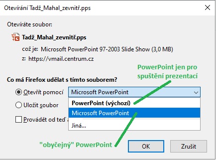 na novém PC jsem si nainstaloval Office a mám jeden dotaz ohledně PowerPointu. Když chci otevřít staženou prezentaci k úpravě, vždy se mi automaticky přes celou obrazovku a bez načítání loga PP spustí prezentace a když zmáčknu Esc, tak se prezentace (i program) vypne. Když jsem otevíral přímo z přílohy e-mailu, měl jsem na výběr dvě možnosti. Jedna fungovala jako obyčejná, k úpravě a druhá se chovala setjně jako u otevírání ze souboru (viz příloha). Nevíte, jak by se dalo nastavit, aby se po každé soubor otevíral v "obyčejném" PowerPointu?