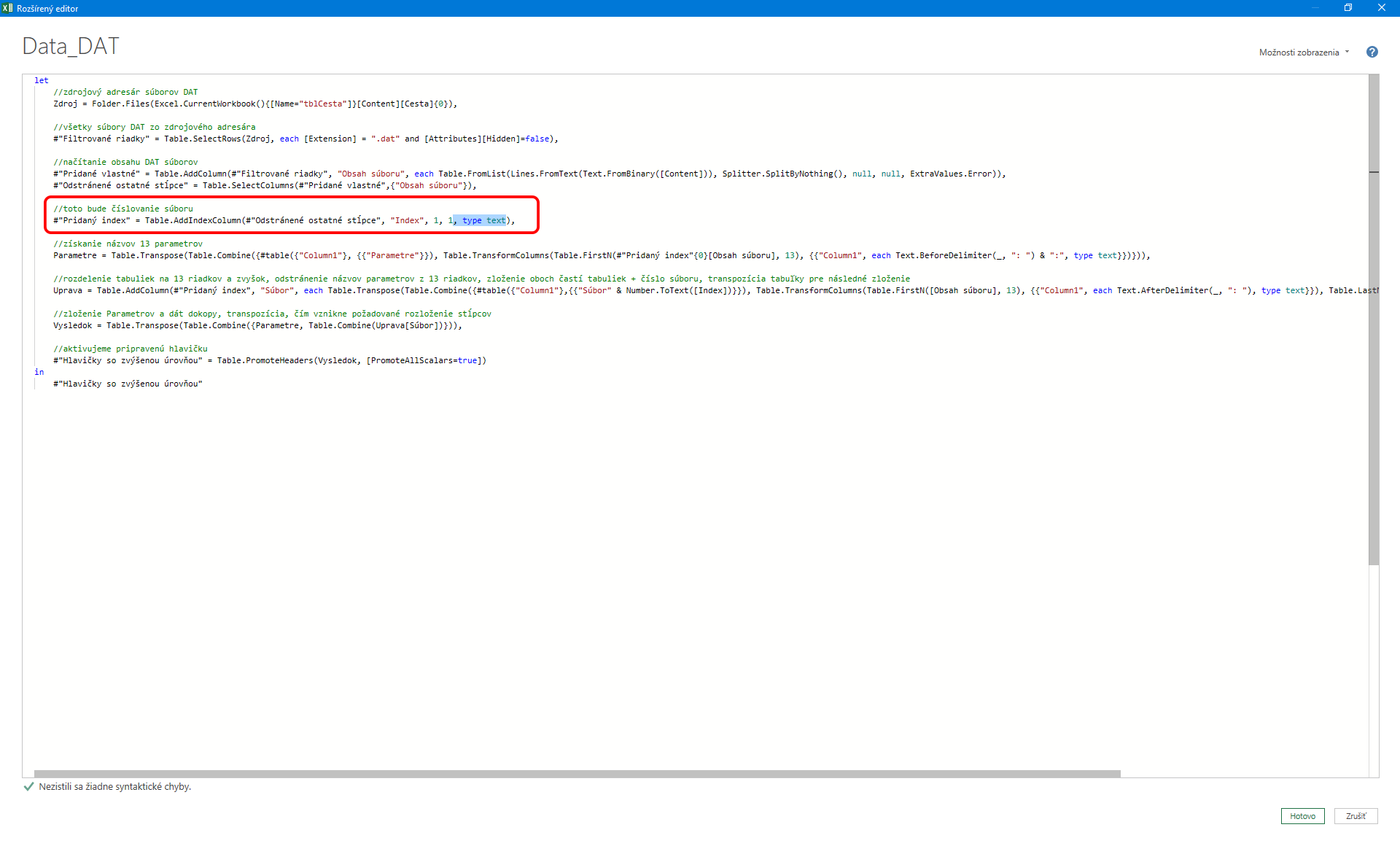 Funkcia Table.AddIndexColumn má 5 parametrov, viď link Microsoft, každopádne odstráňte ten posledný parameter ", type text" je zbytočný.