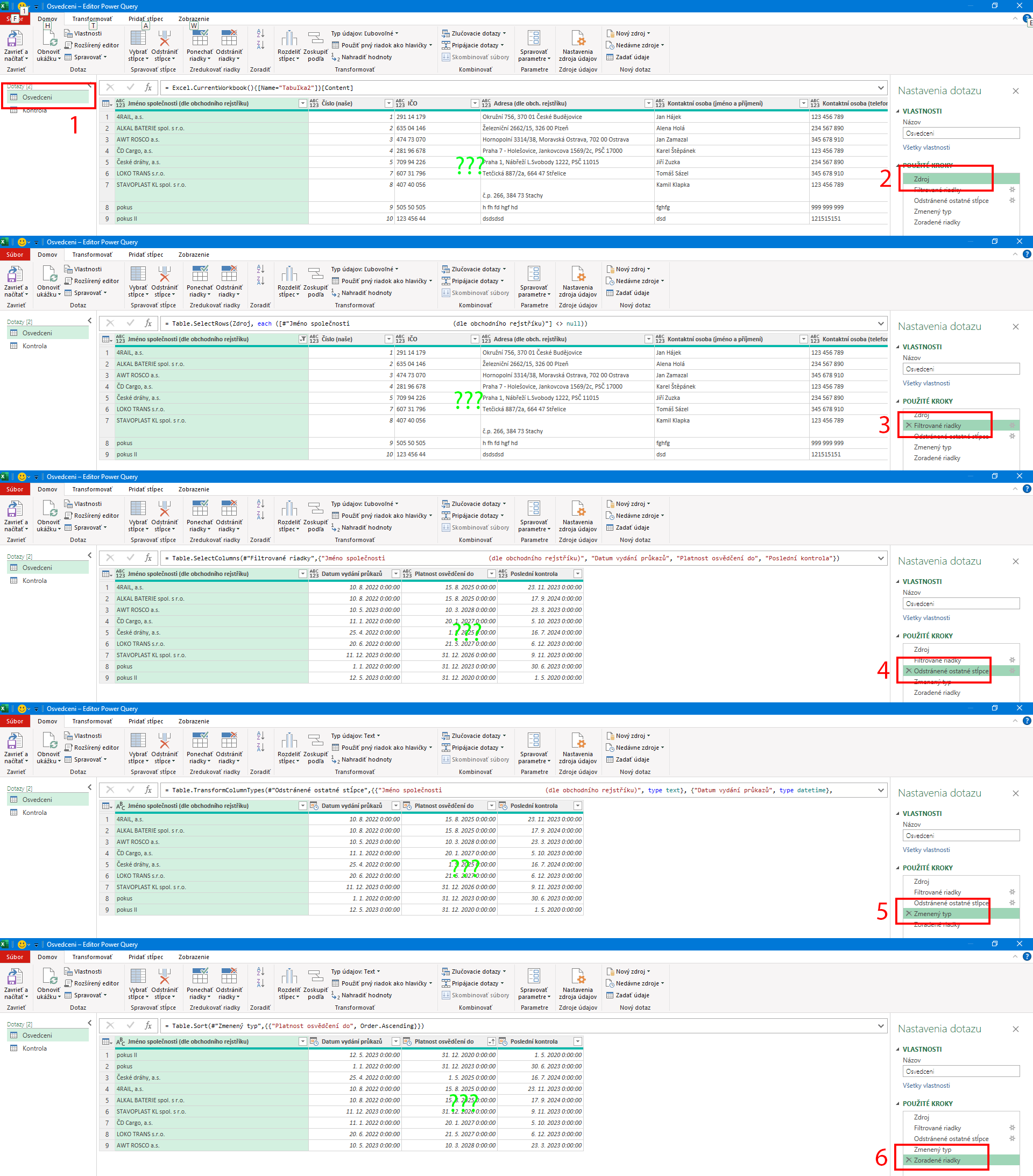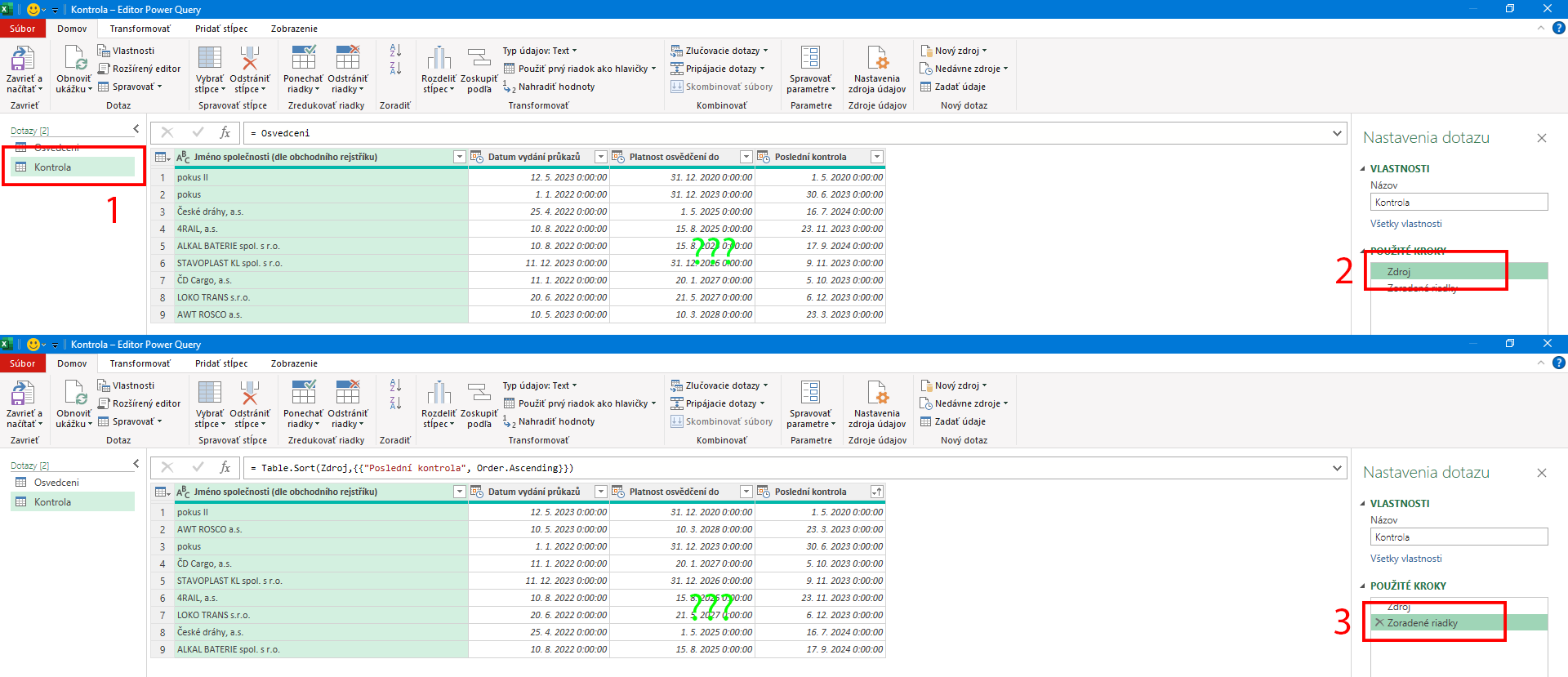Na liste "Konce platnosti osv" pravý klik do Tabuľky - Tabuľka - Upraviť dotaz, vľavo označte dotaz "Osvedceni", vpravo označte prvý krok "Zdroj" v "POUŽITÉ KROKY". Vidíte dáta z Tabuľky?