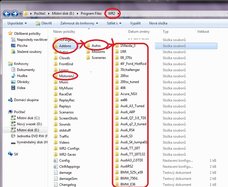 Já Mulťák mám...Jinak ty auta...kopírují se 2 složky: Addons(auto) a Motoren2(zvuk auta).v Addons je složka autos tak tam je potřeba dát to auto(ne přímo do WR2/autos..!!) pokud po rozbalení nejsou názvy složek právě Addons a Motoren2.Přiložím obr.pokud vám to pomůže.