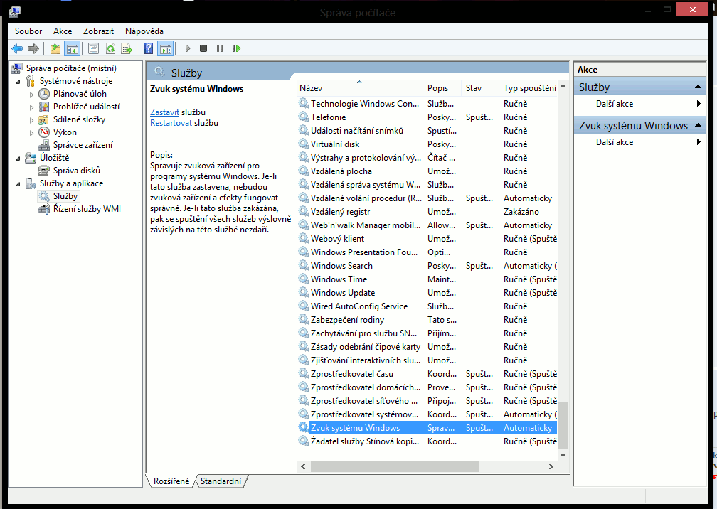 NE !!!! Pravou myší tento počítač - spravovat - služby a aplikace - služby. Jako poslední je tam služby Zvuky systému Win.
