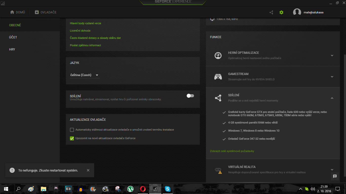 Re: Po aktualizaci GeForce exp. nefunguje shadowplay