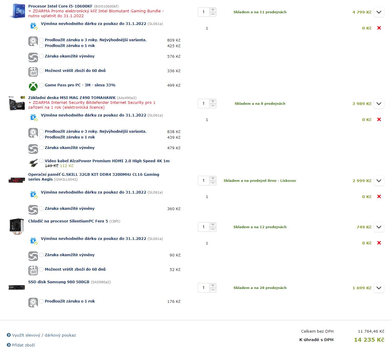 myslím si, že kluci tady ti poradí asi lépe, nicméně já bych šel klidně cestou i5 10600KF, na Alze se dá momentálně sehnat za pěkný peníze, k tomu deska, 32GB RAM, větrák a klidně bych přibalil nějaký větší SSD disk (to už by bylo na tobě). Zdroj by s tím neměl mít problém a jelikož podle monitoru hraješ na 1080p, tak bych do budoucna zvažoval třeba RTX 3060 (https://www.alza.cz/msi-geforce-rtx-306 ... 703312.htm), bohužel ceny jsou zatím poměrně vysoký :D