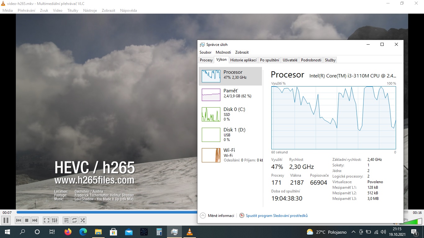 Byl jsem zvědavý zda video H265 rozloží můj starý notebook. Stáhl jsem nějakou zkušební ukázku na netu a vytáhl notebook ze skříně. Video běželo plynule, zatížení procesoru kolísalo 40%-100%.