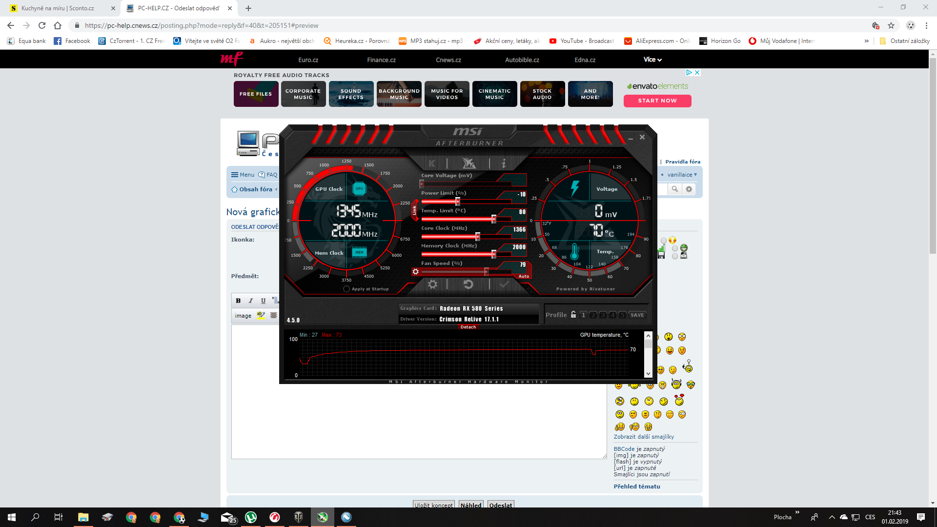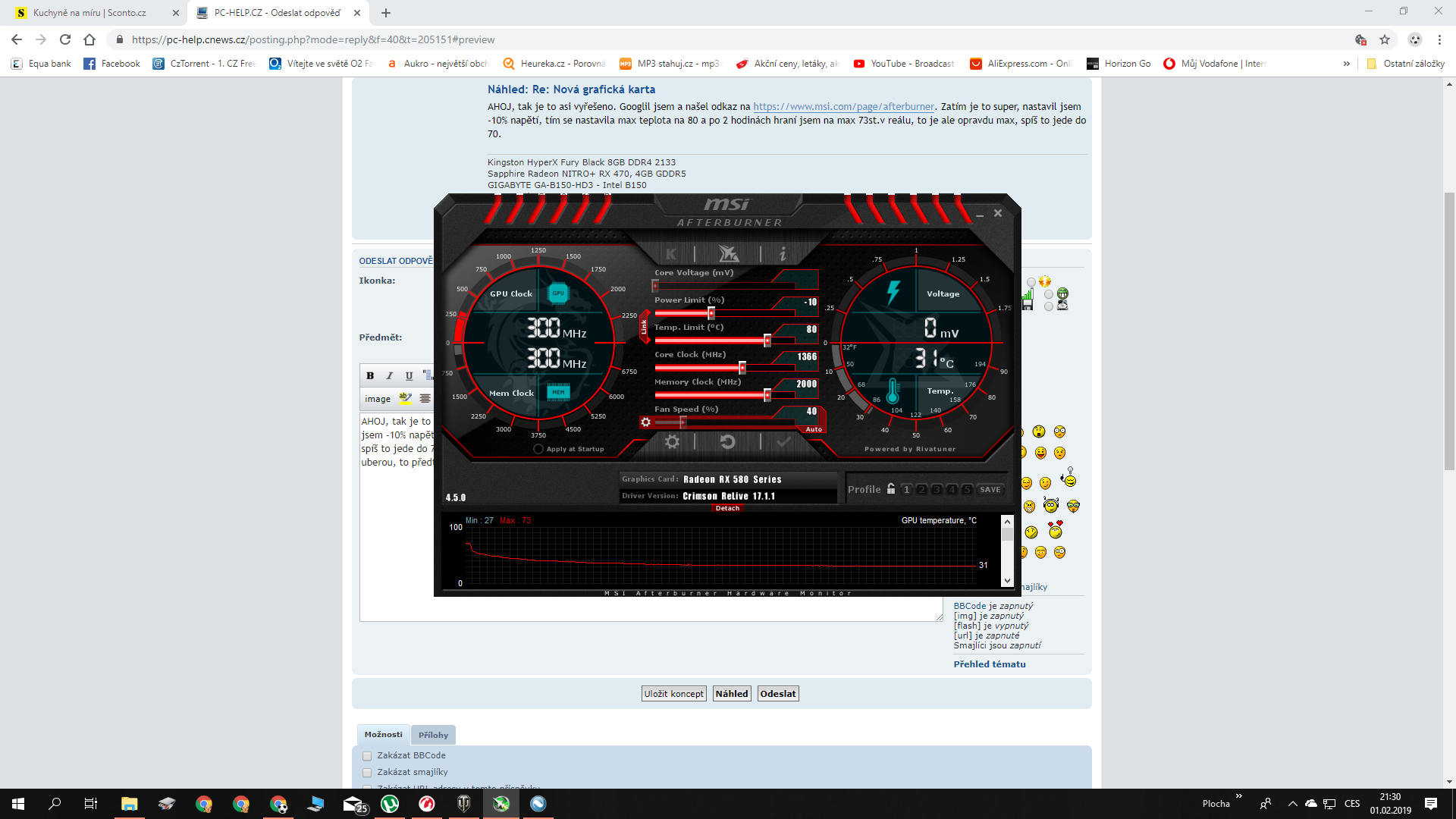 AHOJ, tak je to asi vyřešeno. Googlil jsem a našel odkaz na https://www.msi.com/page/afterburner. Zatím je to super, nastavil jsem -10% napětí, tím se nastavila max teplota na 80 a po 2 hodinách hraní jsem na max 73st.v reálu, to je ale opravdu max, spíš to jede do 70. To už bude asi normální né?? Vždy když se to ohřeje na tech 70 tak se roztočí ventíky a když dohraju tak zas uberou, to předtím nedělalo. Jako by to bios brzdil.