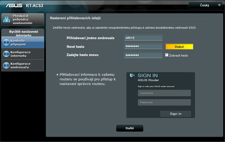 Vlastní nastavení pomocí průvodce (samozřejmě v češtině) je až nechutně jednoduché. Po připojení PC do LAN portu a zapnutí routeru si v prvním kroku router vyžádá změnu hesla do administrace routeru - nechybí signalizace síly hesla. Ve druhém kroku nabídne nastavení WiFi - tedy SSID a heslo na WPA2. Ve třetím kroku jsou žádány údaje od vašeho providera, pokud ale je povolena automatická detekce, pak stačí pouze stisknout "hotovo" a router funguje. Jednodušeji už to prostě nejde. Průvodce lze samozřejmě přeskočit a nastavit router ručně.