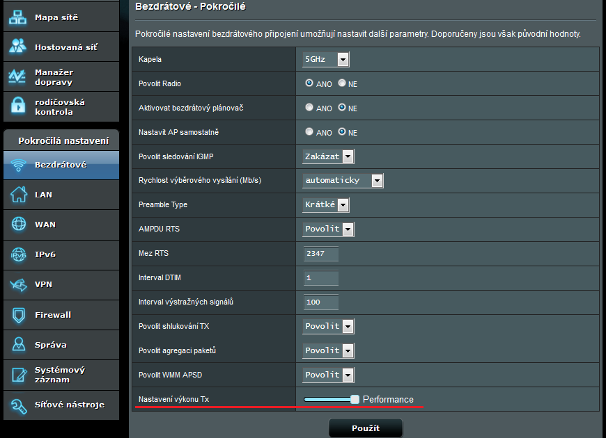 V nabídce "Bezdrátové" lze regulovat vysílací výkon.