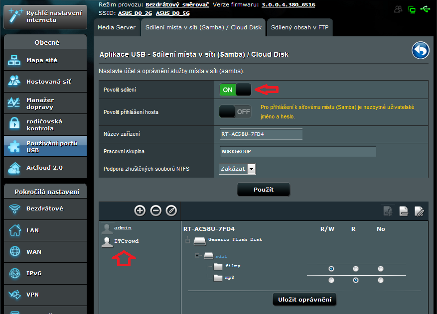 Na obrázku můžete vidět, že kromě admina (správce routeru) zde přibyl ještě uživatel ITCrowd (a ten má svoje heslo). A jak si můžete všimnout, má plná práva k adresáři filmů (tedy zapisovat, číst a mazat), ale k adresáři s mp3 má pouze právo pro čtení.