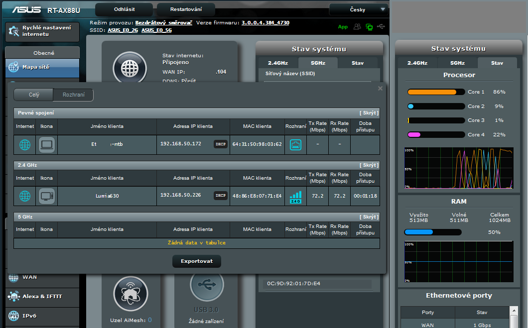 Mapa sítě: Najdete zde všechna připojení zařízení, IP adresy WAN a LAN, MAC adresy, základní informace o WiFi a také vytíženost jader procesoru a paměti. Novinkou je možnost filtrovat zařízení podle druhu připojení.